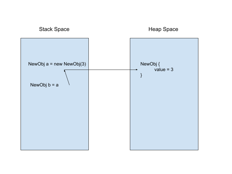 Java treats the two types of variables differently. The object’s attributes are stored in the heap, but the main function runs in the stack. Java creates a reference that points to the object in the heap, and when you want to access the data in that object, you need to dereference the object. So, when you use the assignment operator b = a, Java copies only the reference of that variable, and this is called shallow copying.