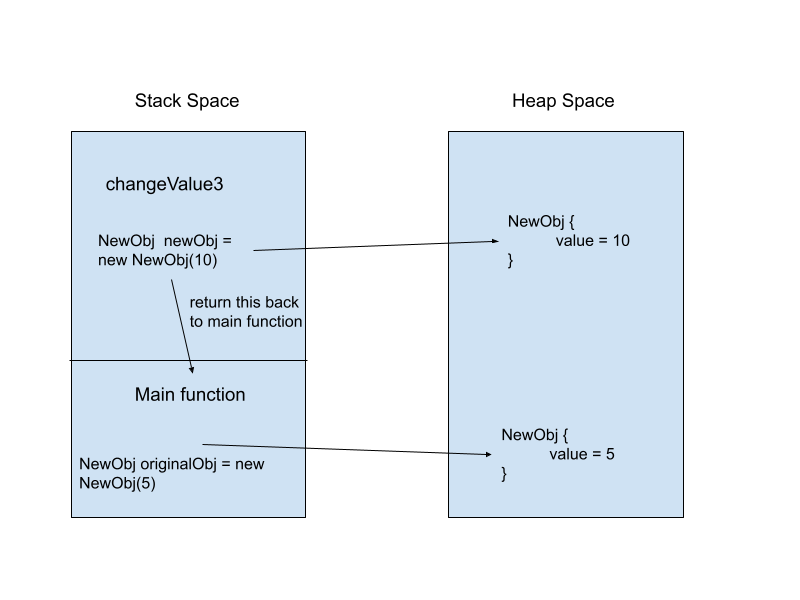 In this changevalue function, we create a new instance and return the reference of that instance. In example 3, we did not catch the return value, so we did not have reference of it, the value stay the same. In example 4, we did assign the returned reference to our originalObj instance, so the value would be 10!