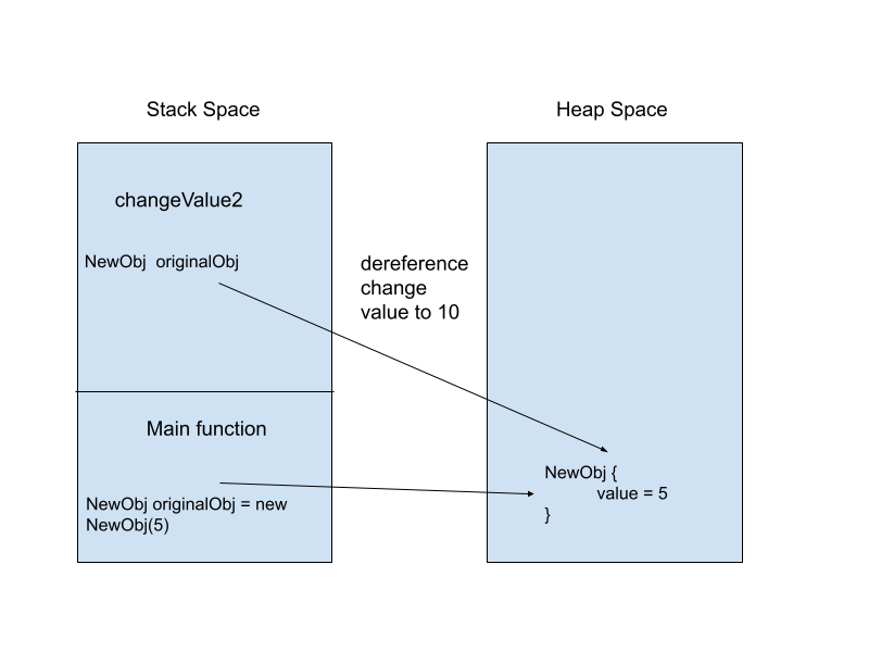 In this example, we directly dereference the value of the object and assign a new value to the object in the heap. Therefore, all other variables that share the same address will reflect the change in value.