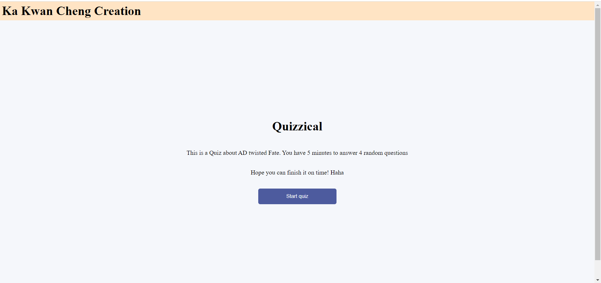 This project is a clone to the normal multiple choices exam that we dealt with throughout our high school and college life. It is a single-page-application. Once the user hit the start button, it will automatically generate four questions from random topics, including history, entertainment, anime, sciences…etc.