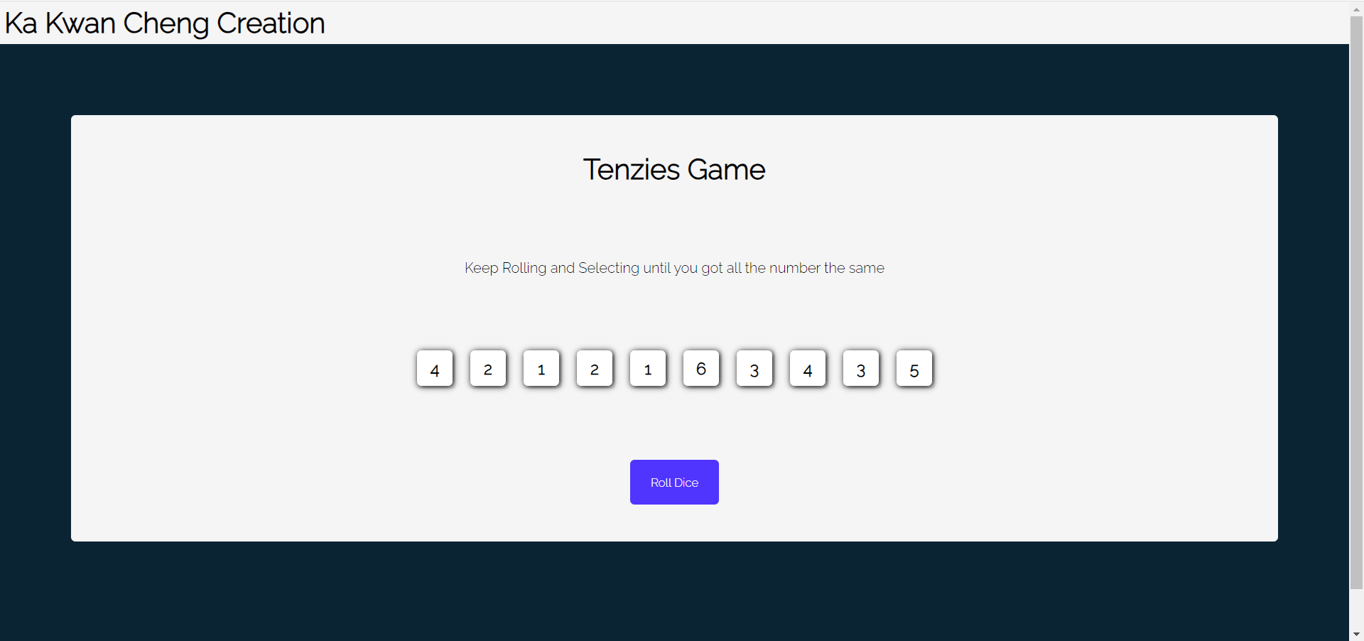 This project is the online web-based version of the dice rolling game, tenzi. User get ten dices to roll. Each time it rolls, user dicided which number to hold and go for. Then, user re-roll other dices until all ten of the dices are the same numbers. Deep down, it is a luck testing game!!